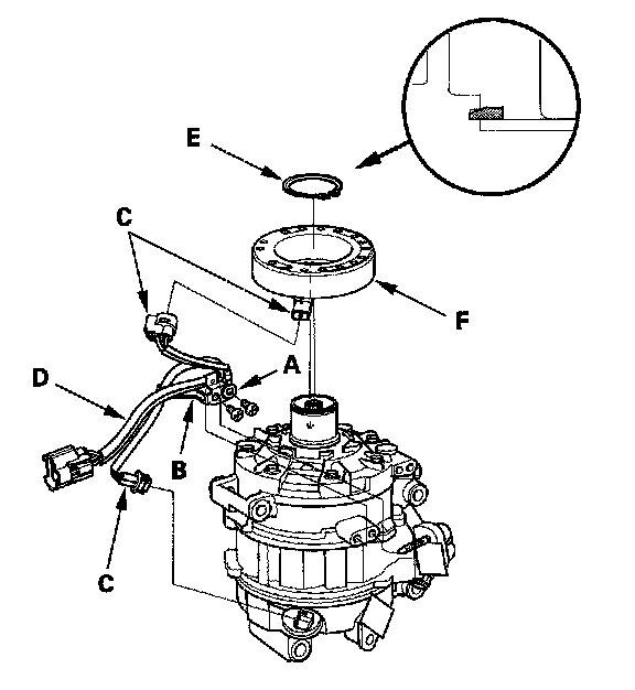 4. Remove the screw from the field coil ground terminal (A) and bracket (B). Disconnect the connectors (C) from the field coil and variable capacity control solenoid valve, then remove the wire harness (D). Remove the snap ring (E) with snap ring pliers, then remove the field coil (F). Be careful not to damage the field coil or the A/C compressor.