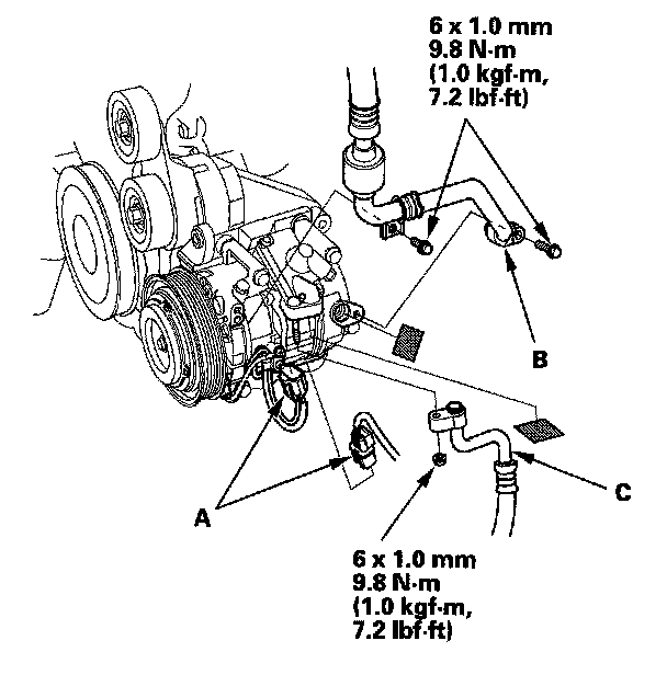 7. Disconnect the NC compressor clutch connector (A). Remove the bolts and the nuts, then disconnect the suction hose (B) and discharge hose (C) from the NC compressor. Plug or cap the lines immediately after disconnecting them to avoid moisture and dust contamination.