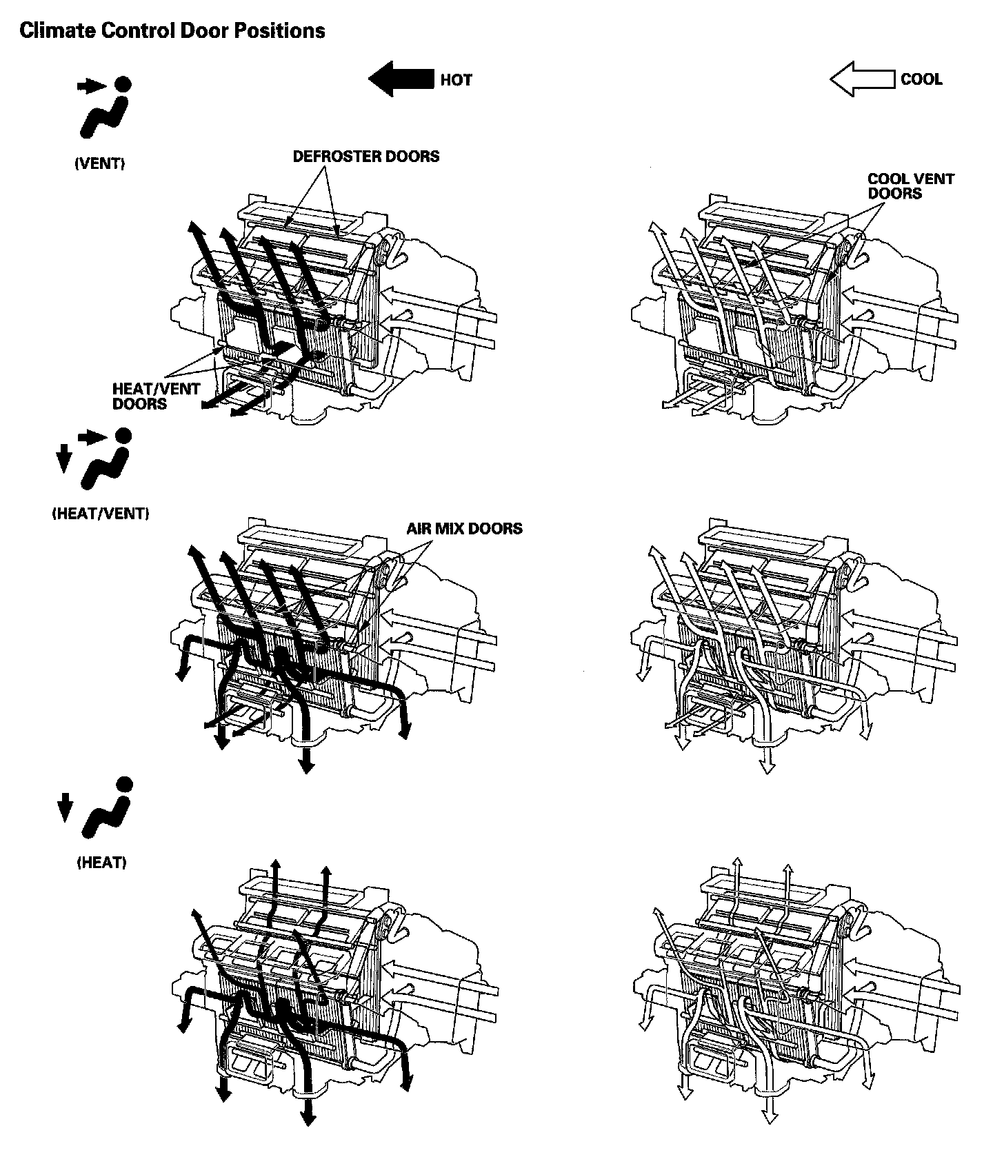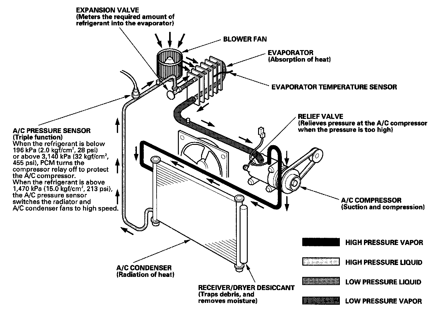 System DescriptionThe air conditioning system removes heat from the passenger compartment by transferring heat from the ambient air to the evaporator. The evaporator cools the air with the refrigerant that is circulating through the evaporator. The refrigerant expands in the evaporator, and the evaporator becomes very cold and absorbs the heat from the ambient air. The blower fan pushes air across the evaporator where the heat is absorbed, and then it blows the cool air into the passenger compartment.