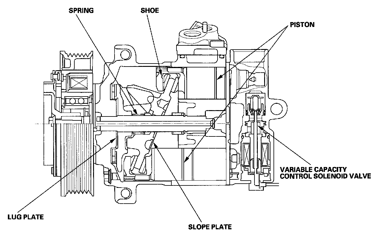 When the shaft rotates, the slope plate rotates by means of the lug plate which is attached to the shaft. The rotational movement of the slope plate is converted through the use of shoes to the reciprocal movement of the pistons, which in turn take in, compress, and discharge the refrigerant.