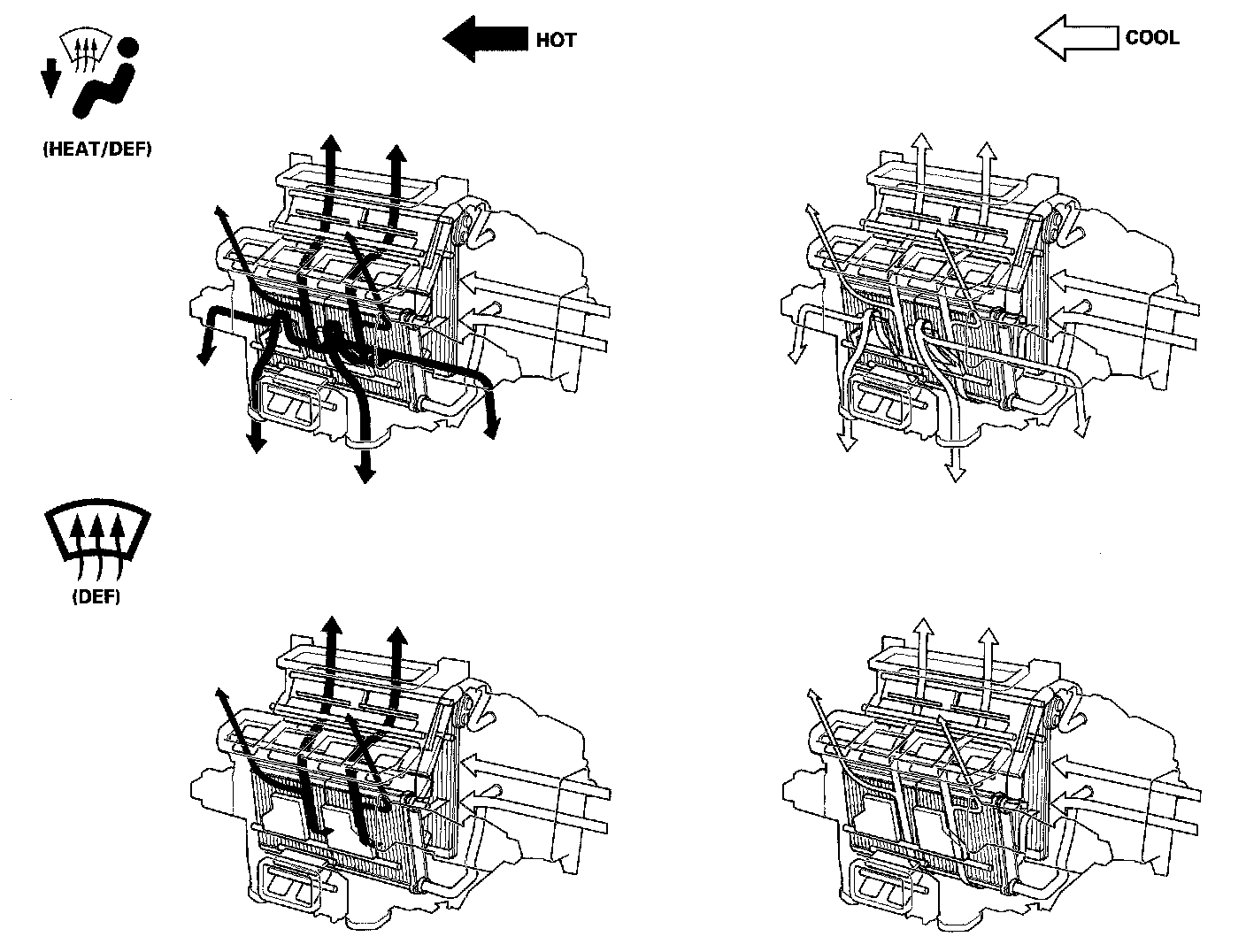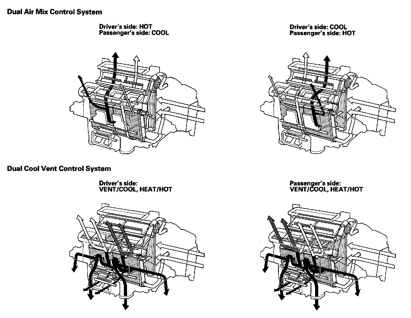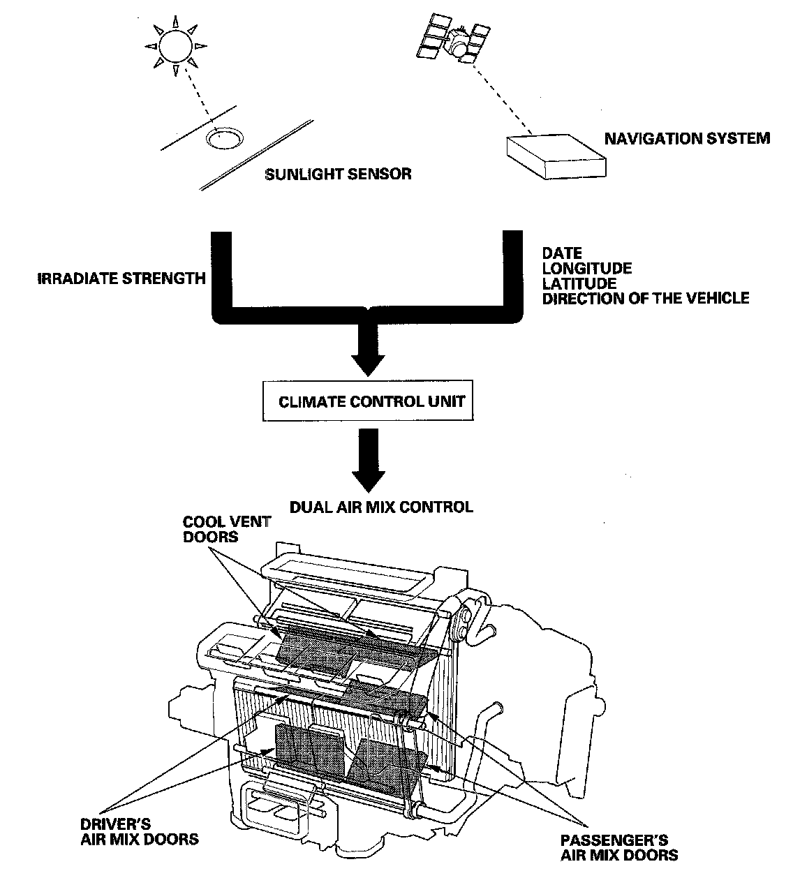 This system automatically controls the temperature and the vent mode of the air direction to the driver and passenger's side depending on the angle of the sun and the direction of the vehicle. It calculates information such as date, time, longitude, and latitude from the navigation system, as well as the irradiate strength of the sun from the sunlight sensor, to determine the appropriate mode position and temperature to be directed to each side.