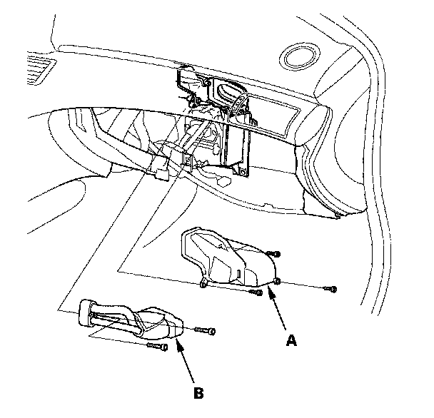 6. Disconnect the connectors (A) from the power transistor and control motor relay, then remove the joint duct (B).