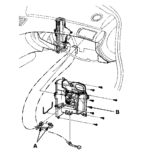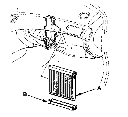 7. Carefully pull out the evaporator core (A) and the plate (B).