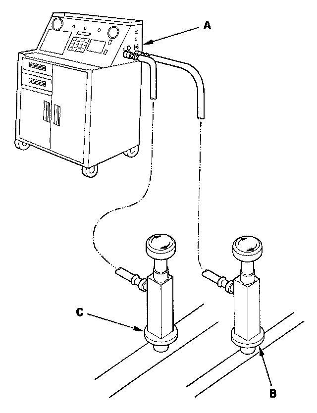 1. Connect an R-134a refrigerant recovery/recycling/charging station (A) to the high-pressure service port (B) and the low-pressure service port (C), as shown, following the equipment manufacturer's instructions.