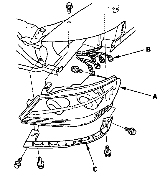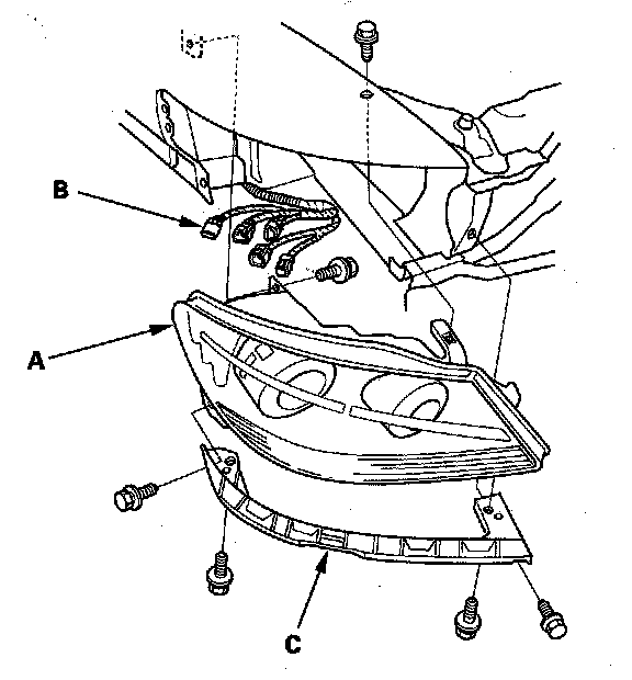 5. Remove the two bolts and the corner upper beam (C)from the headlight.