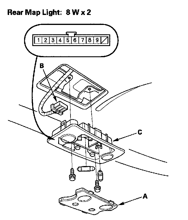 8. Connect battery power to the No. 4 terminal and ground the No. 9 terminal. The right map light should come on.