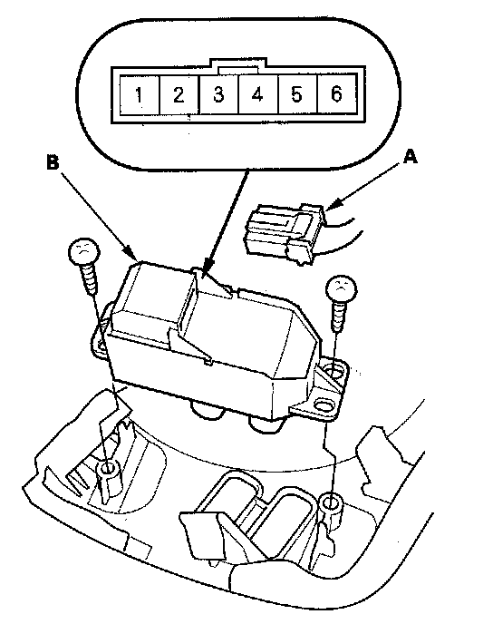2. Disconnect the 6P connector (A) from the dash lights brightness controller (B).
