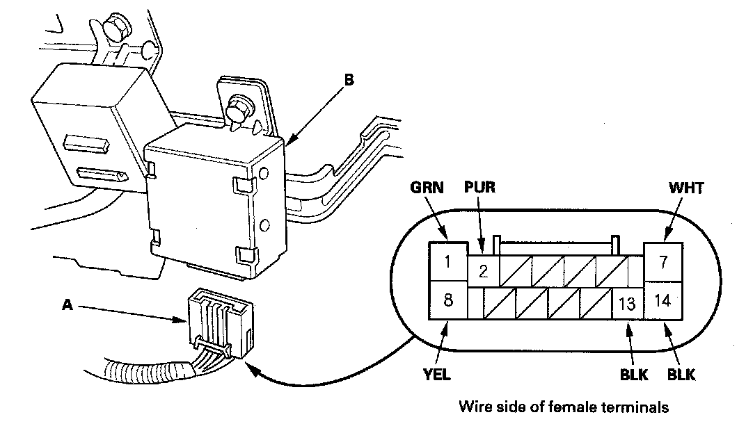 2. Disconnect the 14P connector (A) from the day time running lights control unit (B).