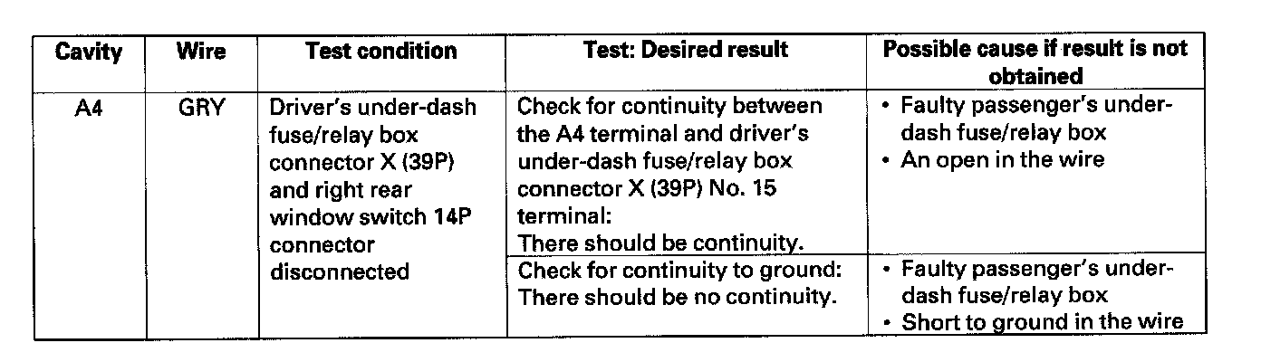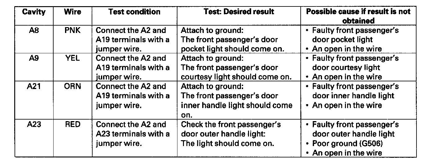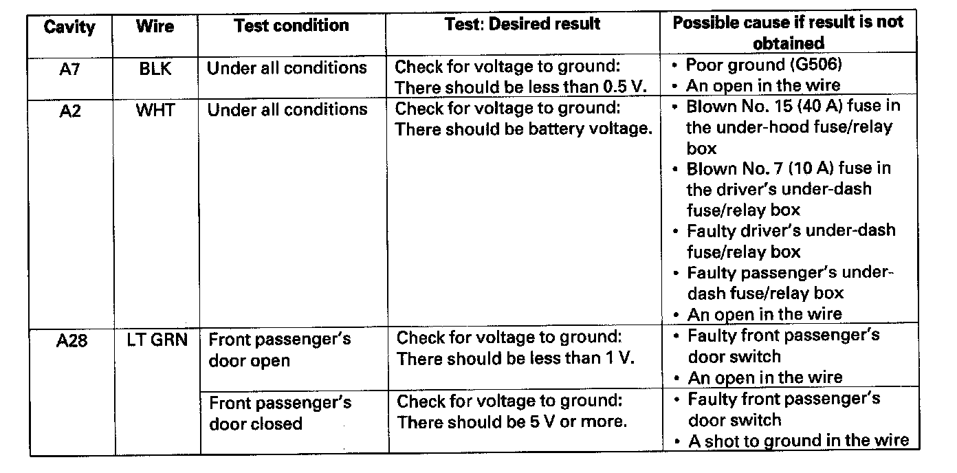 6. Reconnect the connector to the passenger's MPCS unit, and make these input tests at the connector.