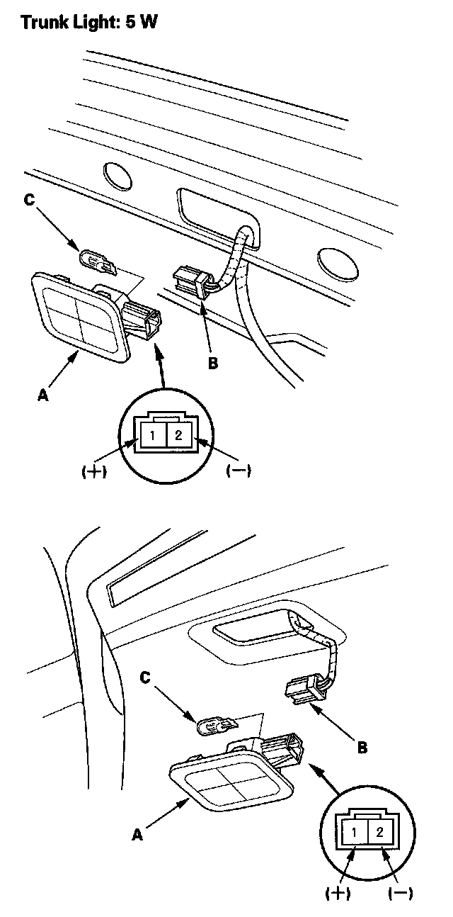 4. Check for continuity between the No. 1 (+) and No. 2 (-) terminals. There should be continuity. If there is no continuity, check the bulb (C). If the bulb is OK, replace the trunk light.