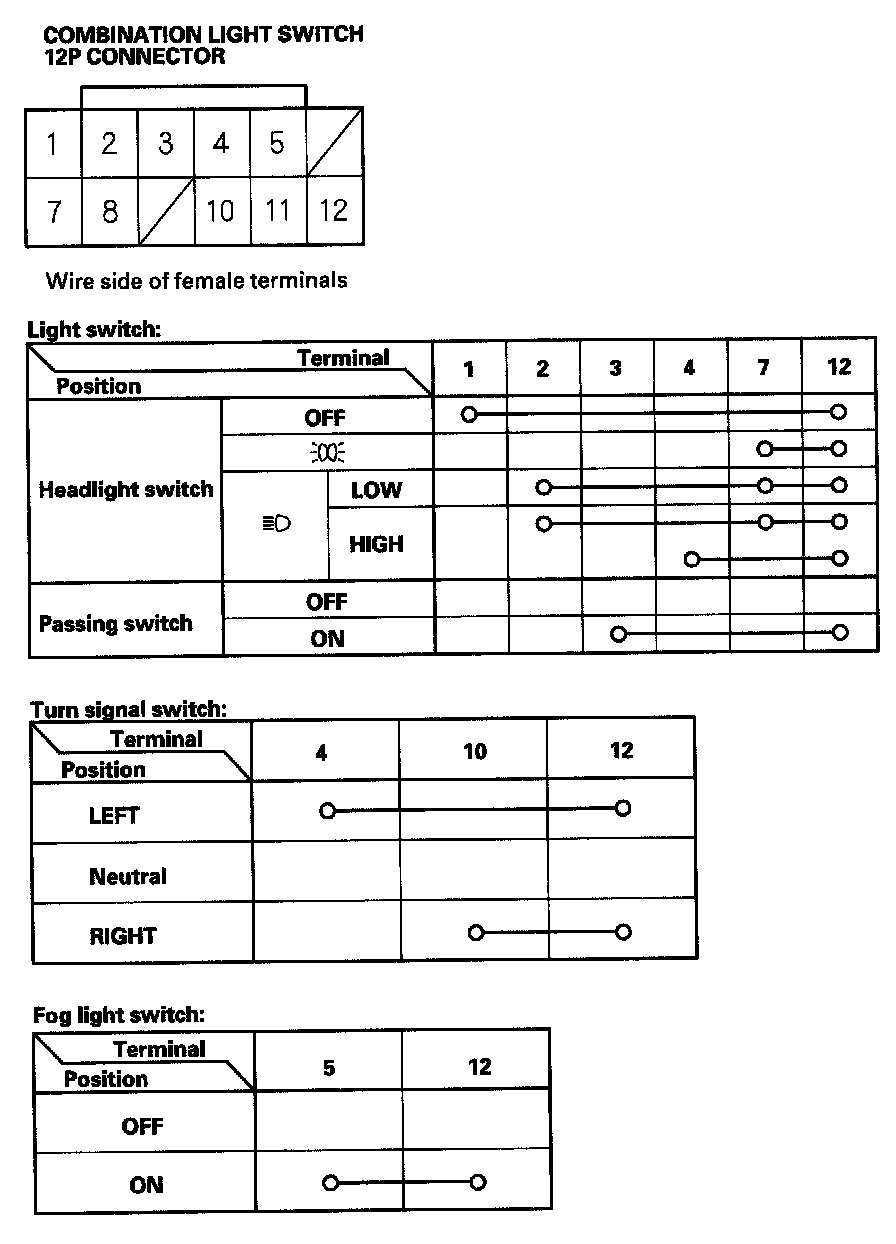 - If the terminals look OK, check for continuity between the terminals in each switch position according to the tables.