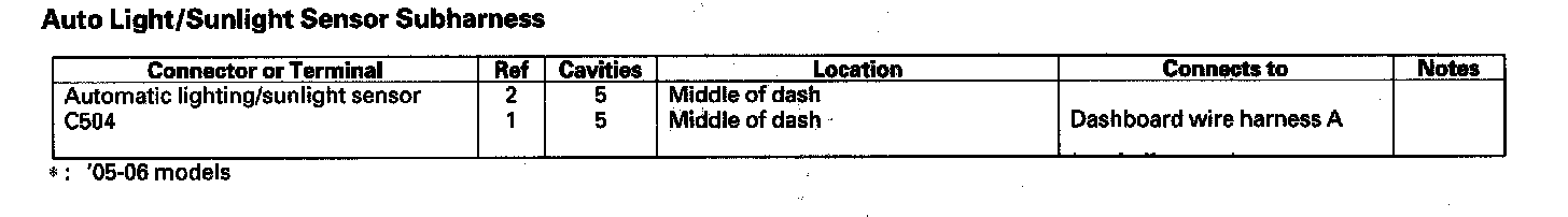 Auto Light/Sunlight Sensor Subharness: