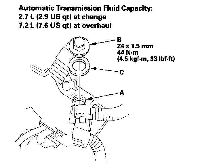 6. Install the ATF filler bolt (B) with a new sealing washer (C).