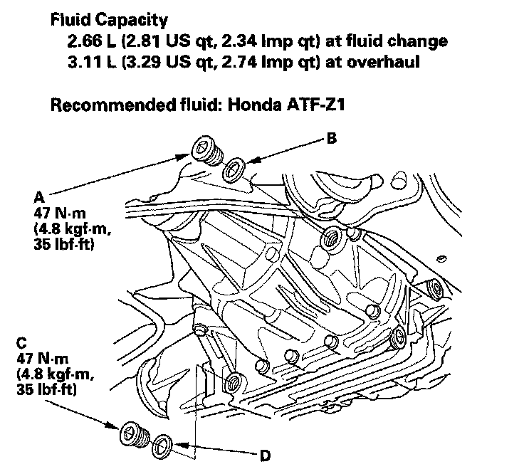 3. Remove the drain plug (C) and the sealing washer (D), and drain the fluid.
