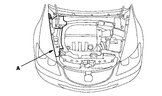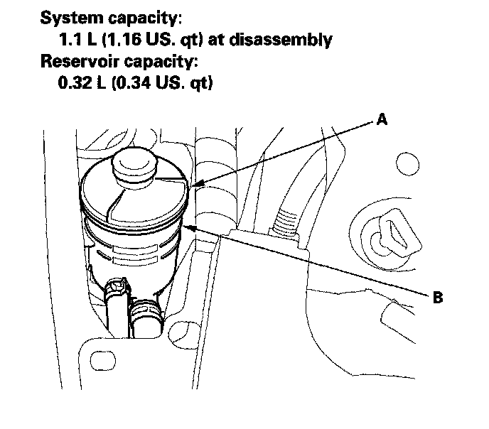 2. Check the reservoir (A) at regular intervals, and add the recommended fluid as necessary to fill the reservoir to the upper level line (B). Always use ACURA Power Steering Fluid. Using any other type of power steering fluid or automatic transmission fluid can cause increased wear and poor steering in cold weather.
