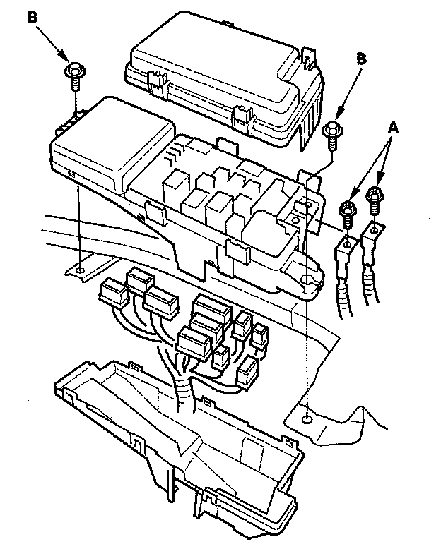 4. Remove the two mounting bolts (B) from the under-hood fuse/relay box.
