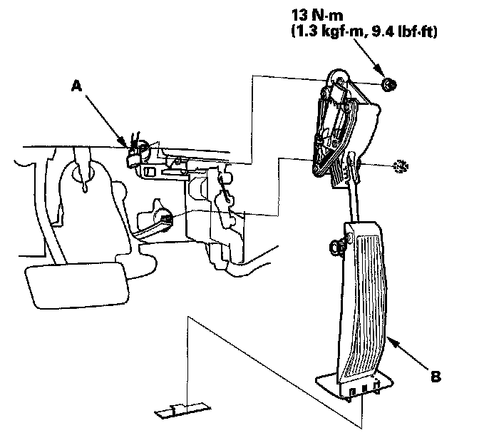 2. Release the lock tab on the base of the accelerator pedal, then remove the accelerator pedal module (B).