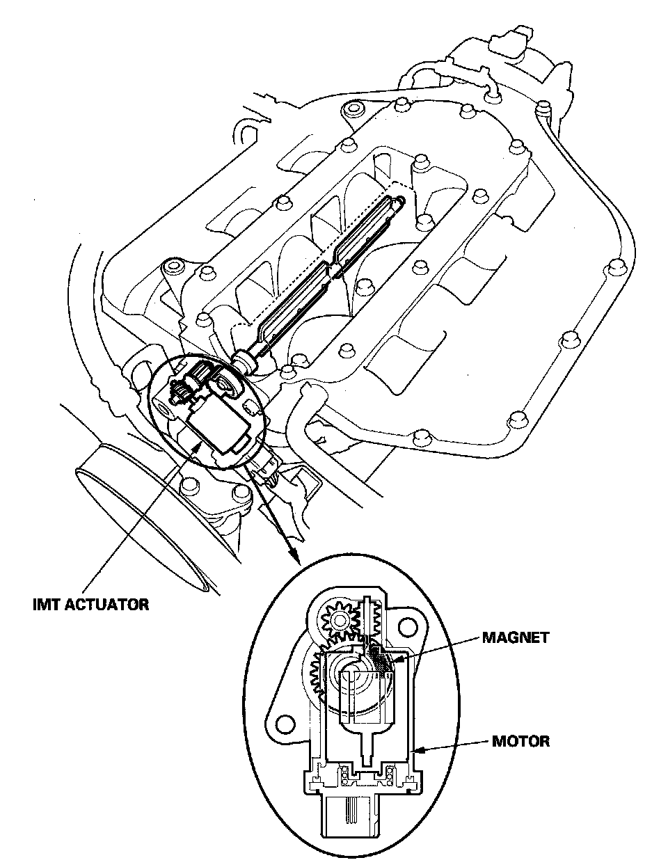 Engine power is enhanced by closing and opening the intake manifold tuning (IMT) actuator. When the valve is closed, there is high torque at low engine speed. When the valve is open, there is high torque at high engine speed. The intake manifold tuning (IMT) actuator has a sensor that detects the IMT valve position and sends it to the PCM.