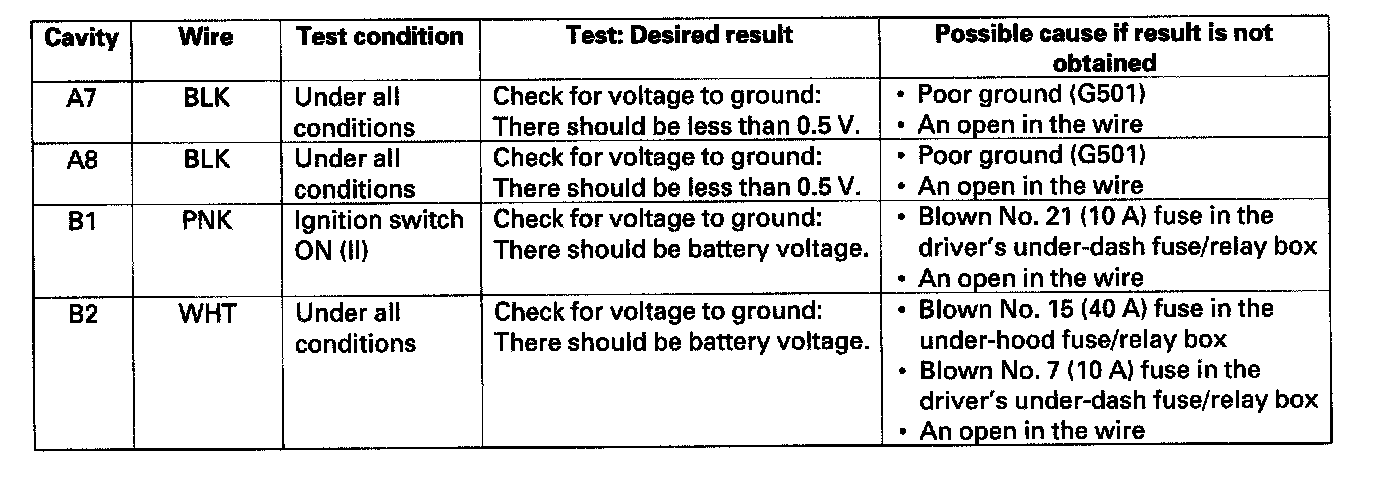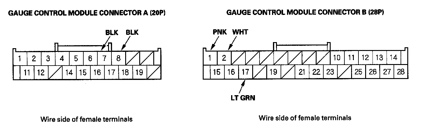 6. Disconnect the connectors from the gauge control module connectors A (20P) and B (28P), and make these input tests at the connector.