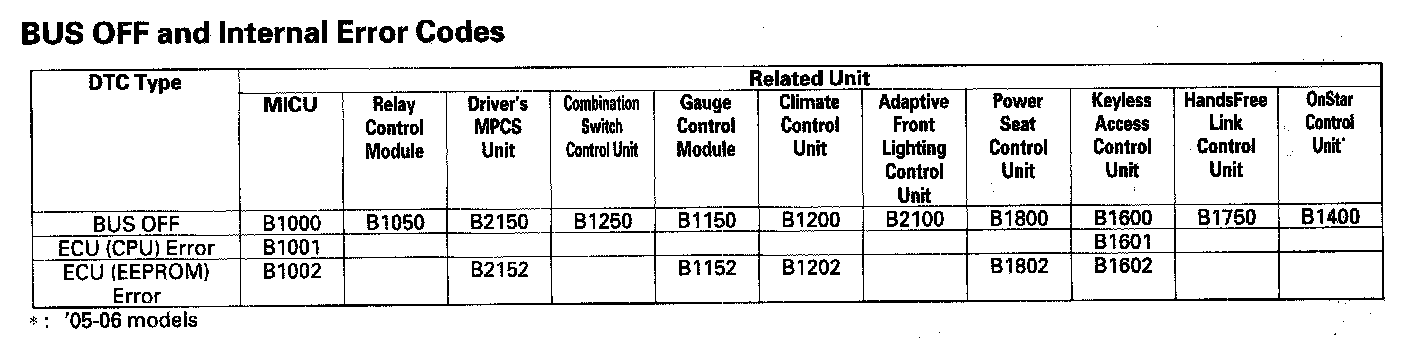3. Loss of communication DTCs (beginning with the lowest number first: for example, if B1005 and B1008 are retrieved, troubleshoot B1005 first).