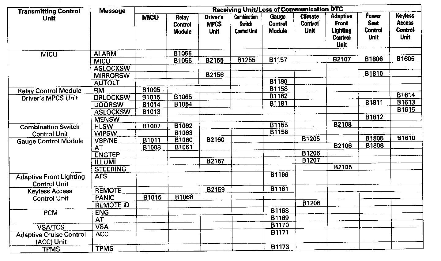 When an ECU is unable to communicate with the other ECUs on the CAN circuit, the other control units will set loss of communication DTCs. Use this chart to find the control unit that is not communicating.