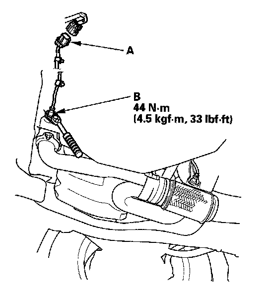 1. Disconnect the rear secondary HO2S 4P connector (A), then remove the rear secondary HO2S (B) with an O2 sensor socket wrench.