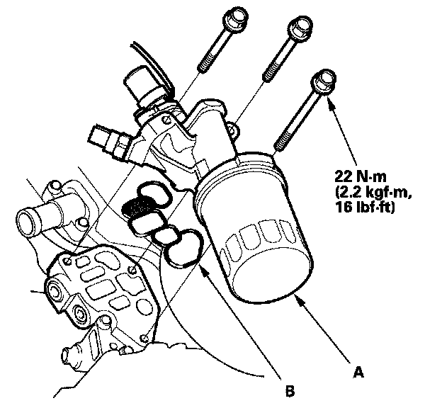 3. Remove the rocker arm oil control solenoid (VTEC solenoid valve/oil filter assembly (A) from the oil pump, and check the rocker arm oil control solenoid (VTEC solenoid valve) filter (B) for a restriction. If there is a restriction, replace the rocker arm oil control solenoid (VTEC solenoid valve) filter, the engine oil filter, and the engine oil.