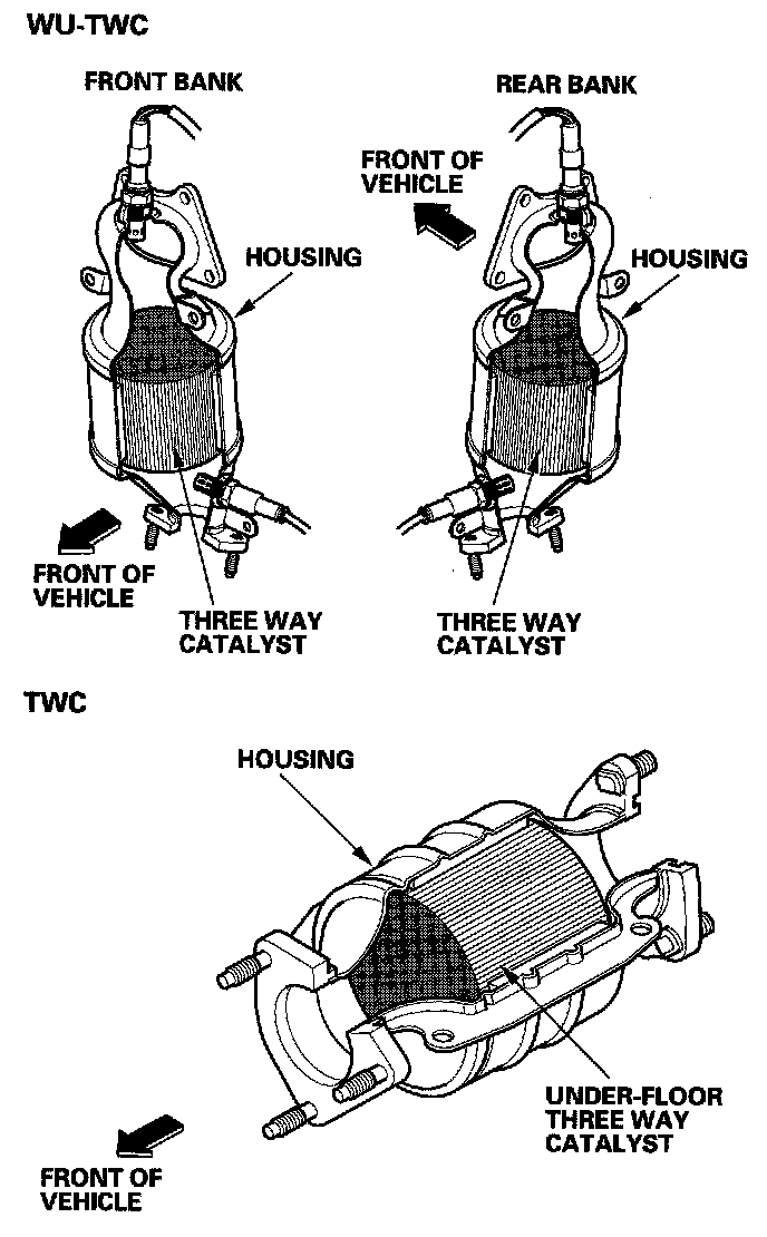 The WU-TWC/TWC converts hydrocarbons (HC), carbon monoxide (CO), and oxides of nitrogen (NOx) in the exhaust gas to carbon dioxide (C02), nitrogen (N2), and water vapor.