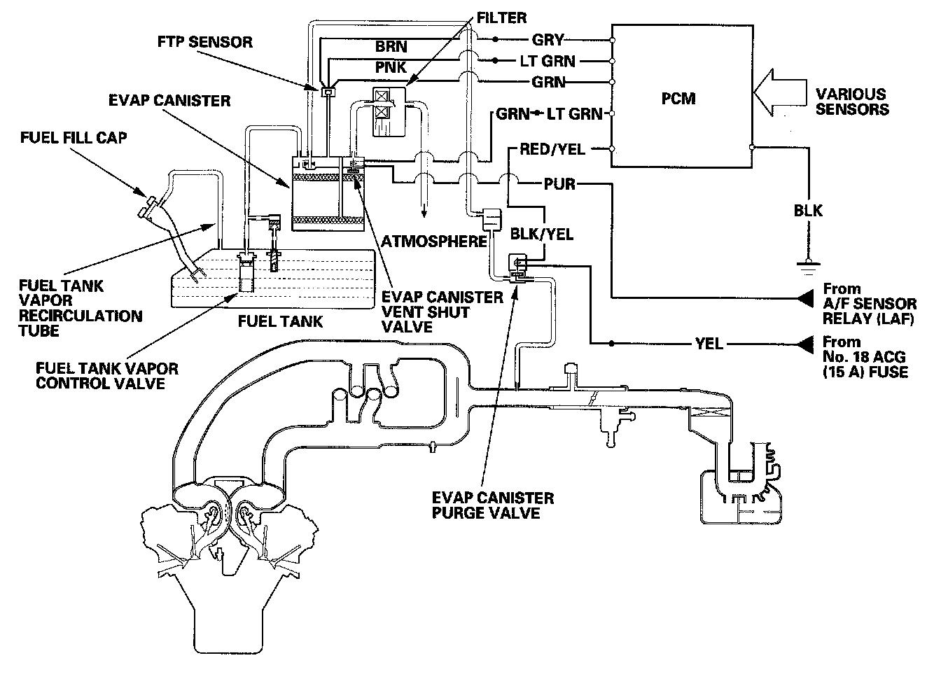 The EVAP controls minimize the amount of fuel vapor escaping to the atmosphere. Vapor from the fuel tank is temporarily stored in the EVAP canister until it can be purged from the canister into the engine and burned.