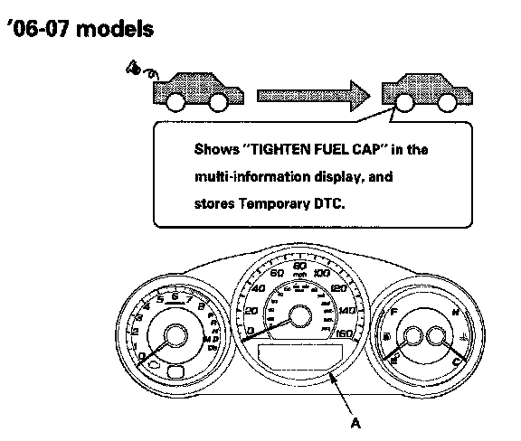 During the first drive cycle after a cold start, the PCM alerts the driver to check the fuel fill cap by showing a ("TIGHTEN FUEL CAP" ('06-07 models)) message in the multi-information display (A), and it stores Temporary DTC P0457 "Evaporative Emission (EVAP) System Leak Detected/Fuel Fill Cap Loose or Missing". Tightening the fuel cap does not make the message go off immediately.