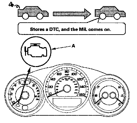 During the third drive cycle after a cold start, if the fuel fill cap is still loose or missing, the PCM stores DTC P0457 "Evaporative Emission (EVAP) System Leak Detected/Fuel Fill Cap Loose or Missing". The malfunction indicator lamp (MIL) (A) comes on, and the ("TIGHTEN FUEL CAP" ('06-07 models)) message goes off.