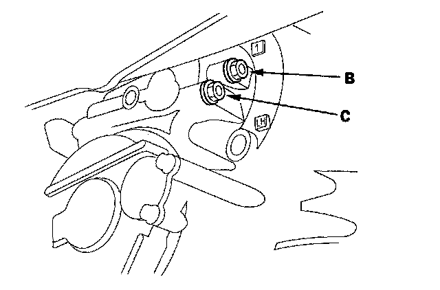 12. Connect the oil pressure gauge to the 1st clutch pressure inspection port (B) and the 1st-hold clutch pressure inspection port (C).