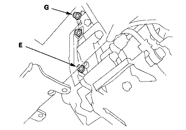 19. Connect the oil pressure gauge to the 3rd clutch pressure inspection port (E) and the 5th clutch pressure inspection port (G).