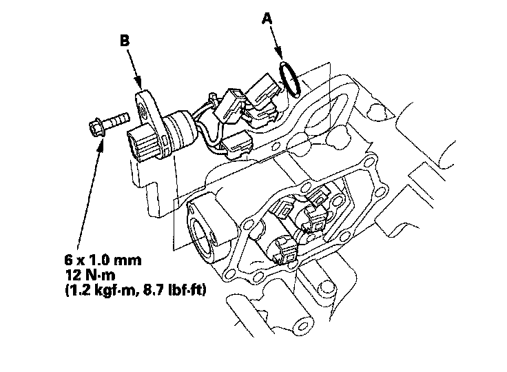 22. Remove the solenoid harness, and install a new O-ring (A) on the solenoid harness connector (B), and install the connector in the transmission housing.
