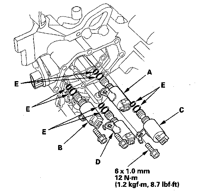 16. Replace the gasket and O-rings (E) with new ones when installing A/T clutch pressure control solenoid valves A and B.