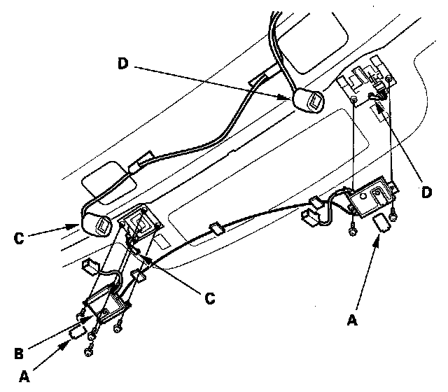 2. Remove the cover (A) from the satellite signal XM antenna module (B), then disconnect the satellite signal feeder connectors (C) and terrestrial signal feeder connectors (D).