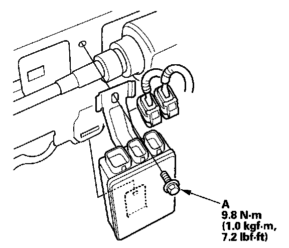 1. Place the new front passenger's weight sensor unit on the seat riser. Tighten the mounting bolt (A), and connect the connectors.