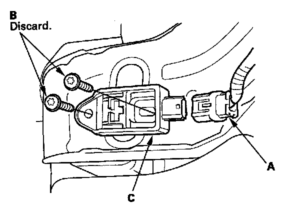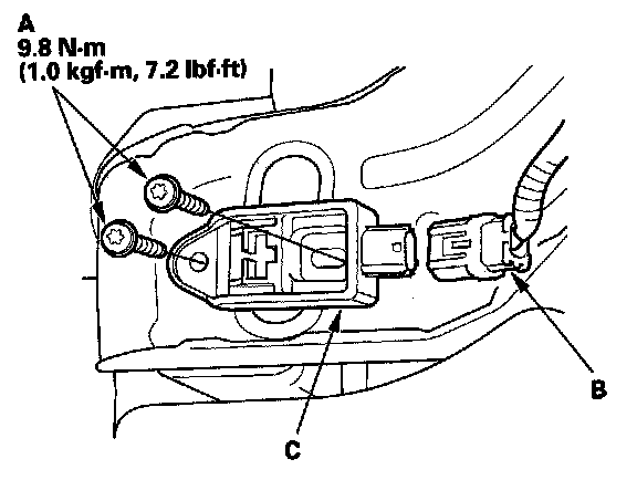 1. Install the new front impact sensor with new TORX bolts (A), then connect the engine compartment wire harness 2P connector (B) to the front impact sensor (C).