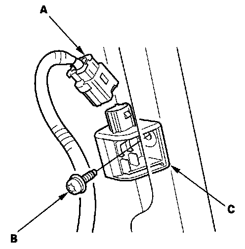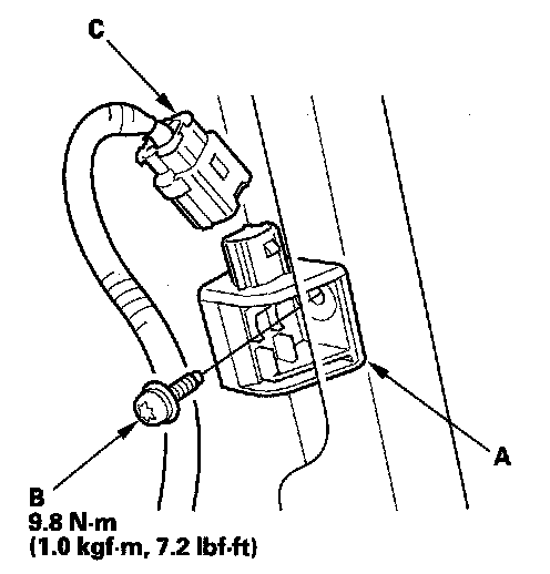 1. Install the new side impact sensor (second) (A) with the TORX bolt (B), then connect the floor wire harness 2P connector (C) to the side impact sensor (second).