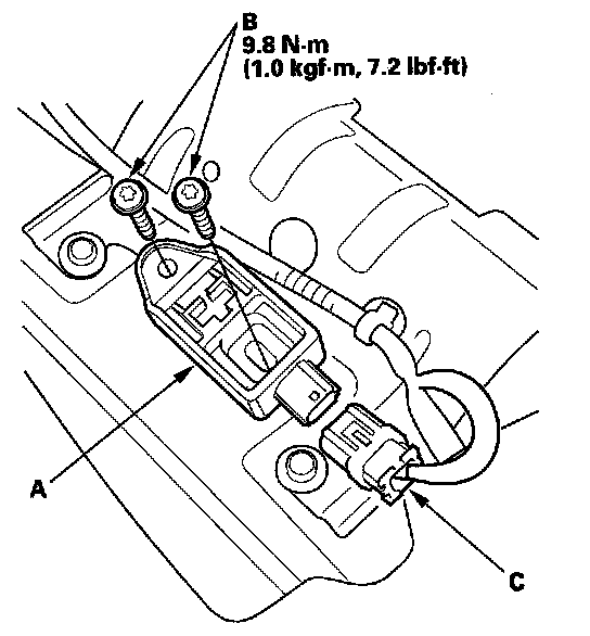 1. Install the new rear safing sensor (A) with the TORX bolts (B) then connect the left side wire harness 2P connector (C). to the rear safing sensor.