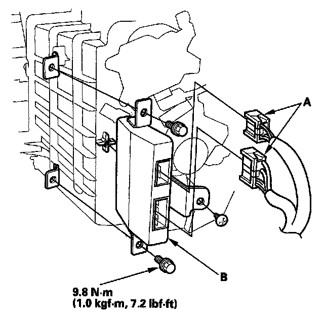 2. Disconnect the connectors (A) from the e-pretensioner unit (B).