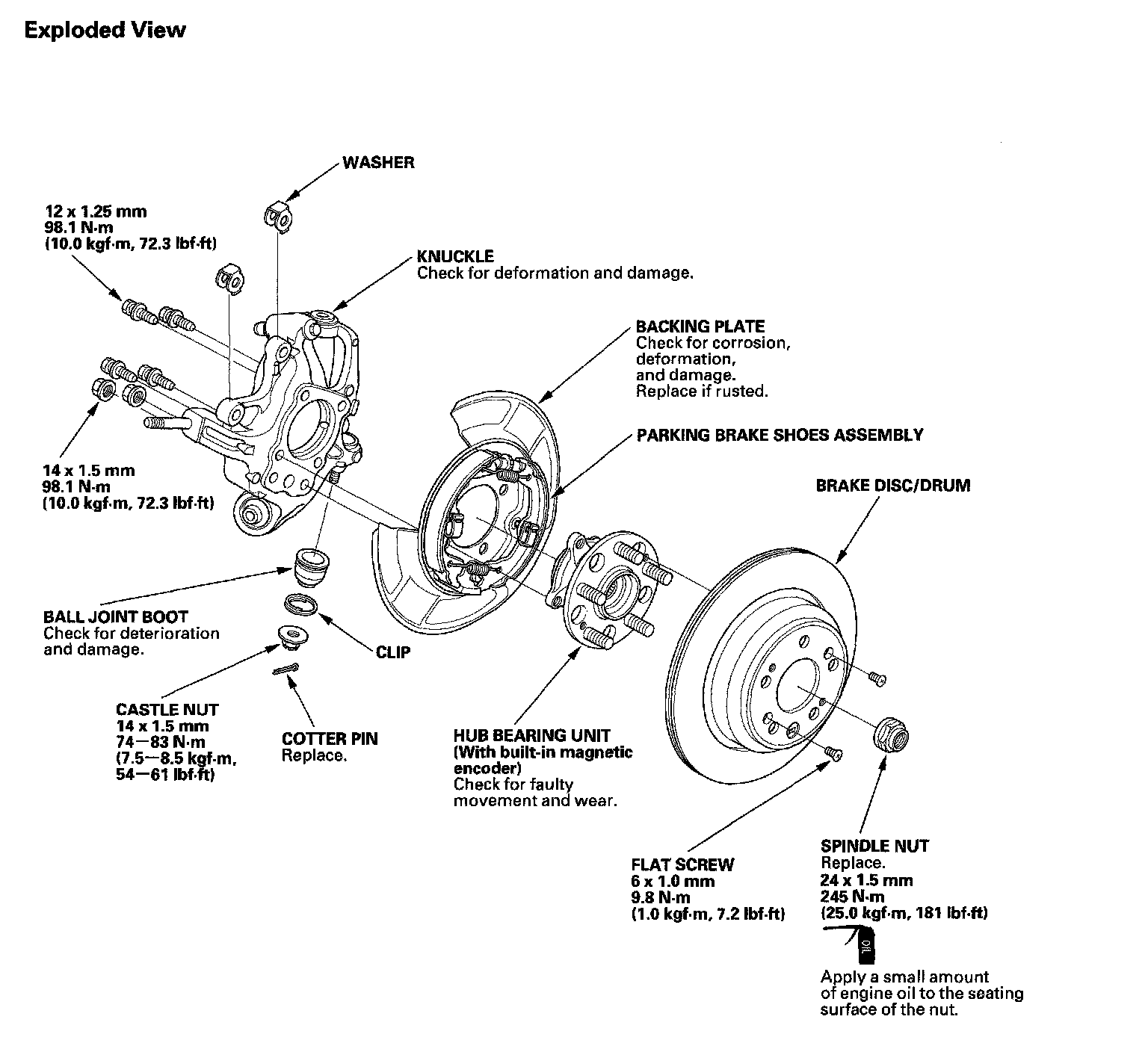 Before installing the spindle nut, apply a small amount of engine oil to the seating surface of the nut. After tightening, use a drift to stake the spindle nut shoulder against the driveshaft.