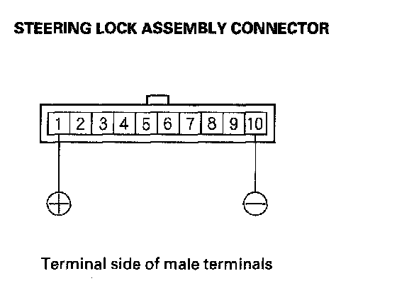 4. Connect the positive battery terminal to steering lock assembly connector terminal No. 1, and connect the negative battery terminal to No. 10 terminal. Make sure that the ignition key cannot be turned to LOCK (0) position. Release the battery terminals, and make sure that the key can be turned to LOCK (0) position and removed from the cylinder.