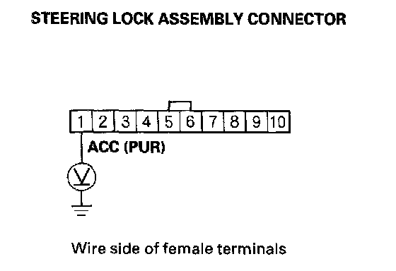 5. Measure voltage between steering lock assembly connector terminal No. 1 and body ground.