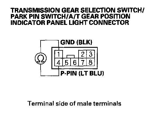 9. Check for continuity between transmission gear selection switch/park pin switch/A/T gear position indicator panel light connector terminals No. 1 and No. 4 while the shift lever is in the P position, and when the shift lever is out of the P position.