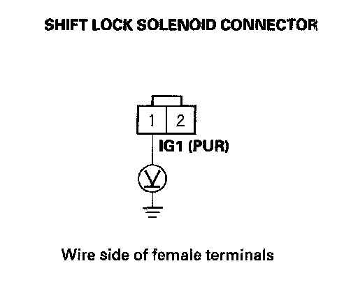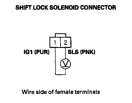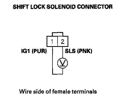 9. Release the brake pedal, and measure voltage between shift lock solenoid connector terminals No. 1 and No. 2. The shift lever must be in the P position.