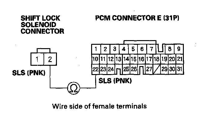 13. Check for continuity between PCM connector terminal E22 and shift lock solenoid connector terminal No. 2.
