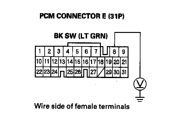 18. Measure voltage between PCM connector terminal E8 and body ground while pressing the brake pedal and when the brake pedal is released.