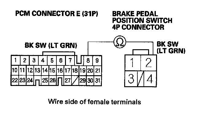 19. Check for continuity between PCM connector terminal E8 and brake pedal position switch 4P connector terminal No. 2.