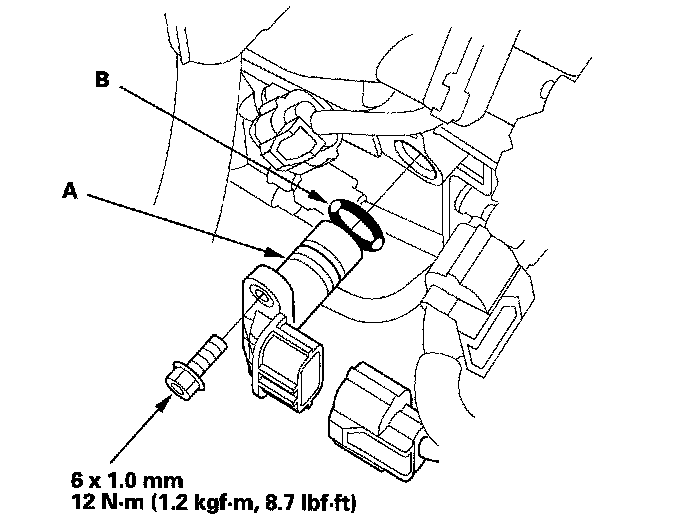 2. Install the new O-ring (B) on the new output shaft (countershaft) speed sensor, then install the output shaft (countershaft) speed sensor in the transmission housing.